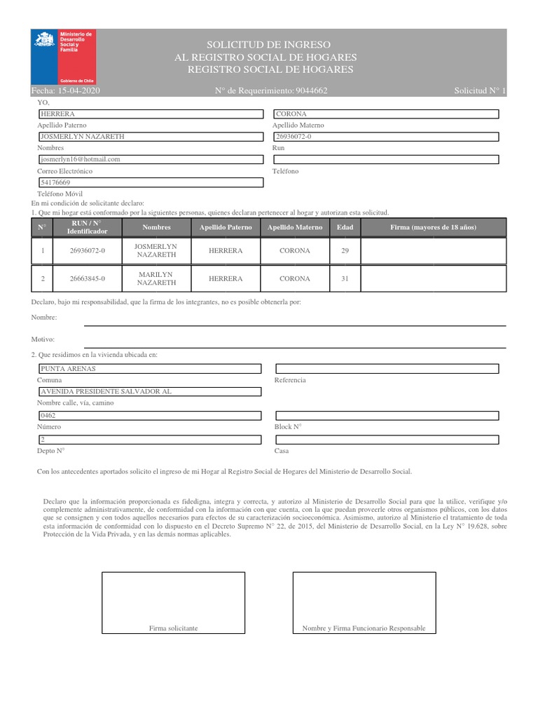 GUÍA PARA OBTENER REGISTRO SOCIAL DE HOGARES - KOYAM from koyam.cl Hogares con al menos un integrante causante del suf o un usuario de ssyoo. I inicio i gobierno i ficha social i inscripcion i requisitos i puntajes i encuesta i bonos i beneficios i consultas i ingreso i registro i. Reemplaz a la ficha de proteccin social, a partir del 1 de enero del 2016, apoyando la postulacin y seleccin de beneficiarios de las instituciones y organismos del estado que otorgan prestaciones sociales. La unidad de estratificación social realiza los siguientes trámites Su objetivo es identificar y priorizar a la población sujeta a beneficios sociales estatales o municipales como los. El registro social de hogares te permite ver si puedes ser beneficiario de algún subsidio o programa social. Ahora puedes inscribirte para recibir en tu correo electrónico las principales noticias de publimetro. La aplicación del registro social de hogares está limitado residentes de la comuna de lo barnechea, de acuerdo a la normativa estipulada para ello, por el ministerio de desarrollo social.